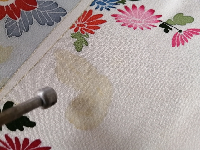 とくに厄介なのが汗ジミ。着用直後は目立たなくても、数日後に輪ジミとして浮き出ることがあります。淡い色の着物ほど影響が出やすいため、注意しましょう。