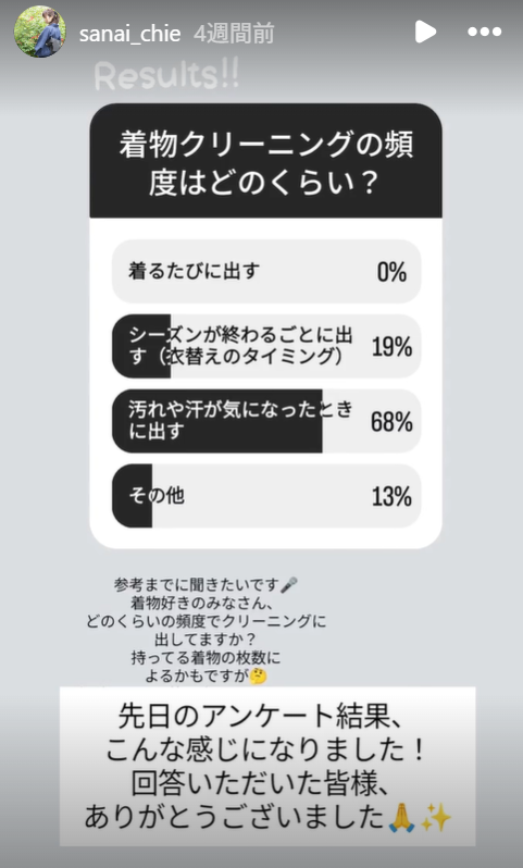 今回アンケートに回答いただいた方は、着物を日常的に着用している方がほとんど。そのため、状態を良好に保つためには、しまい込むよりも「着る」ことが大切なのではと改めて感じました。どの着物もなるべく出番を作り、着用後には風を通す。この積み重ねが、結果的にクリーニング頻度を抑えることにもつながっているのではないのかと思います。