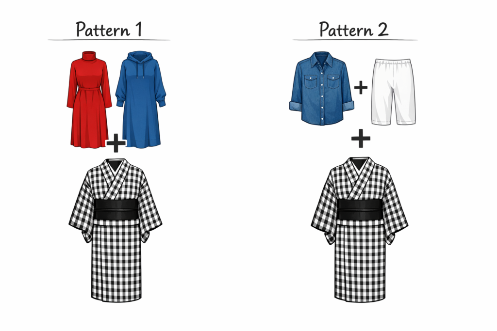 帯だけでなく着物ももっと気軽に着付けたい!という方は、洋ミックスコーデを試してみて。着物の下にワンピースを着たり、シャツやブラウス+ステテコやペチコートを合わせたりすれば、長襦袢や裾除けといった下着類をショートカットできます。